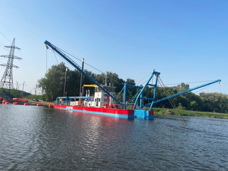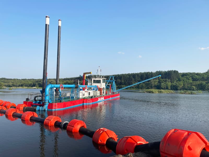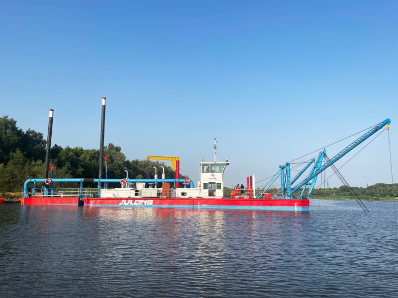 Draga JuLong con capacidad de bomba de 0-2500 m3/hr, profundidad de dragado de 10,0 m, distancia de descarga de 0-2 km, son pontones desmontados para transporte en camión, esta draga de tamaño mediano es muy popular en Rusia para el dragado de ríos y lagos.